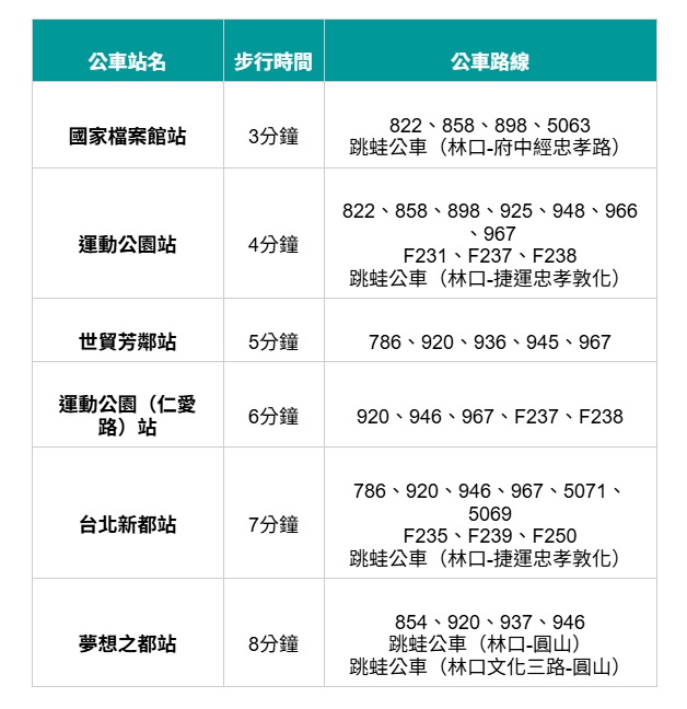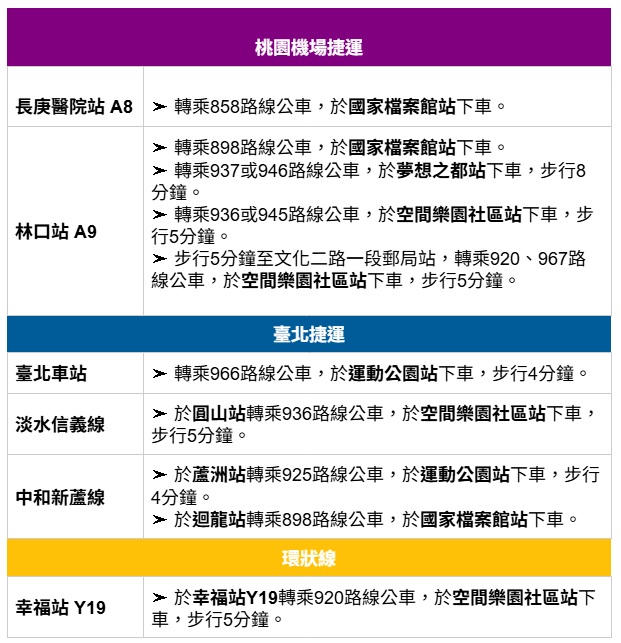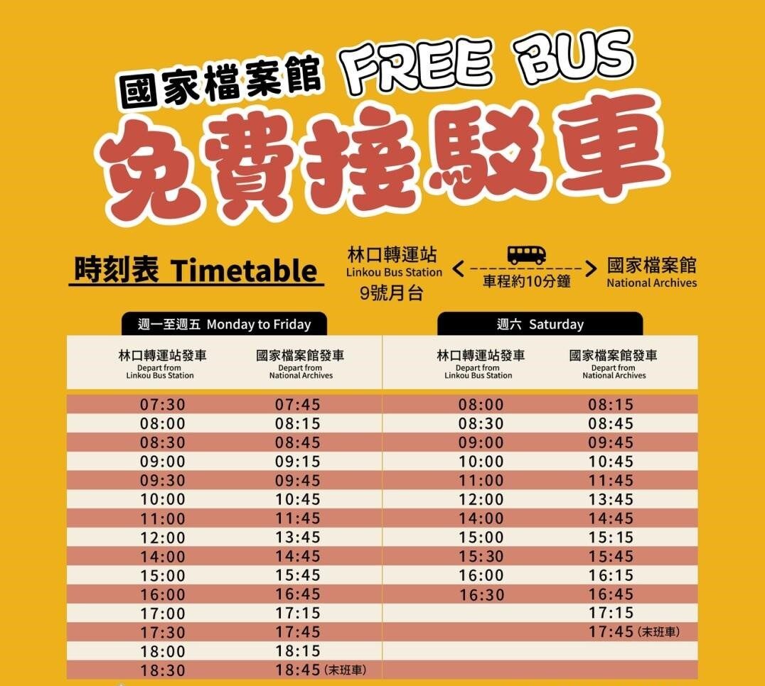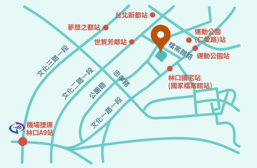 桃園機場捷運A9林口站旁林口轉運站9號月台→國家檔案館正門(車程約10分鐘)